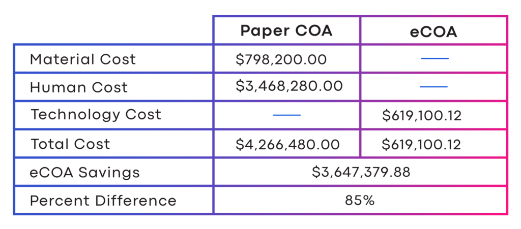 When deciding whether to invest in paper clinical outcome assessments (COAs) or electronic clinical outcomes assessments (eCOAs), as a relatively inexpensive commodity, paper may seem to be the least expensive option.